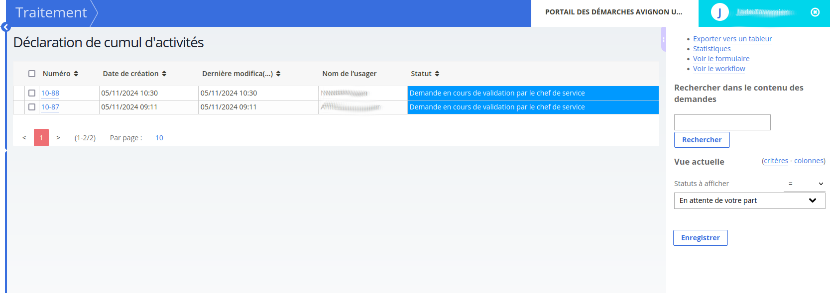 Voici ci dessous la vue de traitement avec un tableau composé des demandes en attente de traitement de votre part.