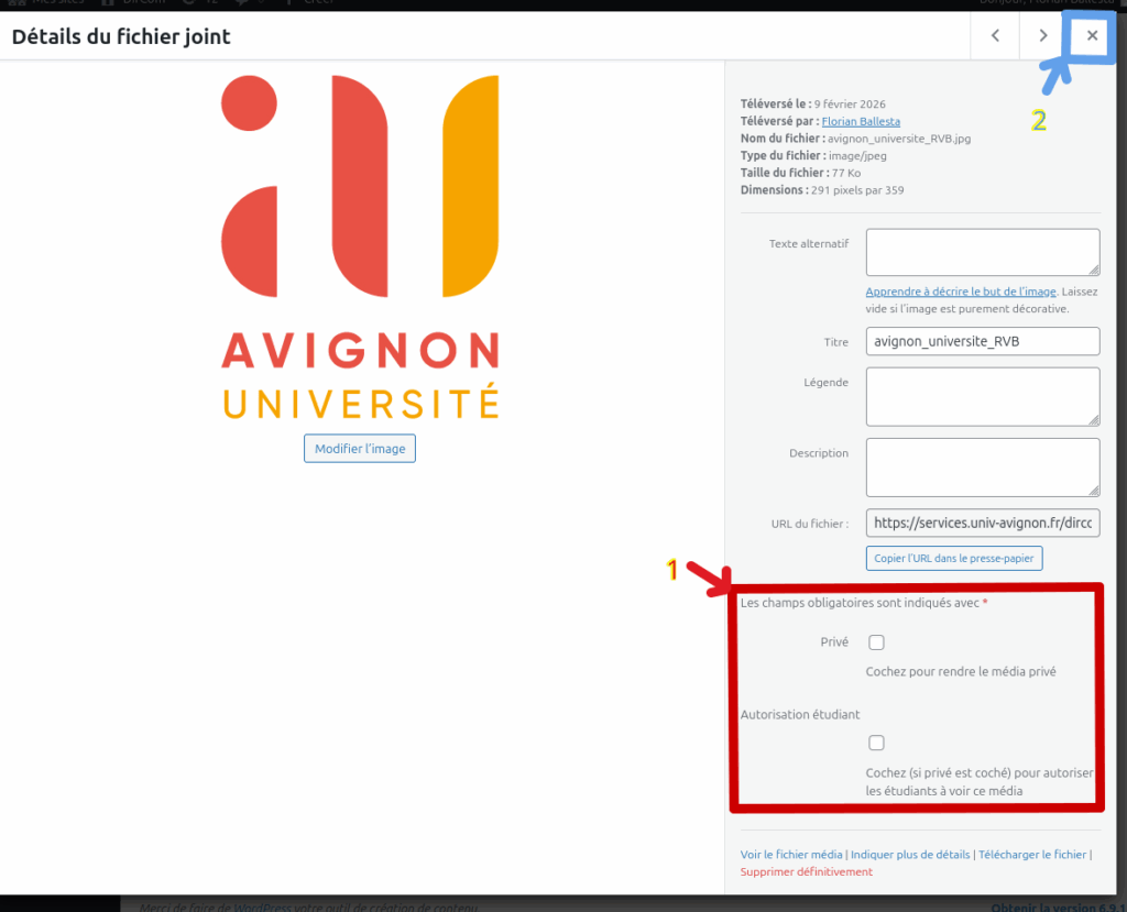 1 – Cocher la case « Privé » pour rendre le document accessible uniquement aux personnes connectées (enseignants et administratifs).