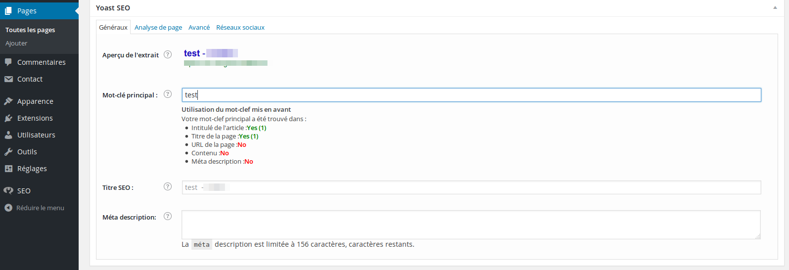 2- Après avoir rempli votre contenu et après l’avoir mis à jour (bouton « Mettre à jour »), allez sur l’onglet « Analyse de la page » afin d’obtenir les conseils adéquats