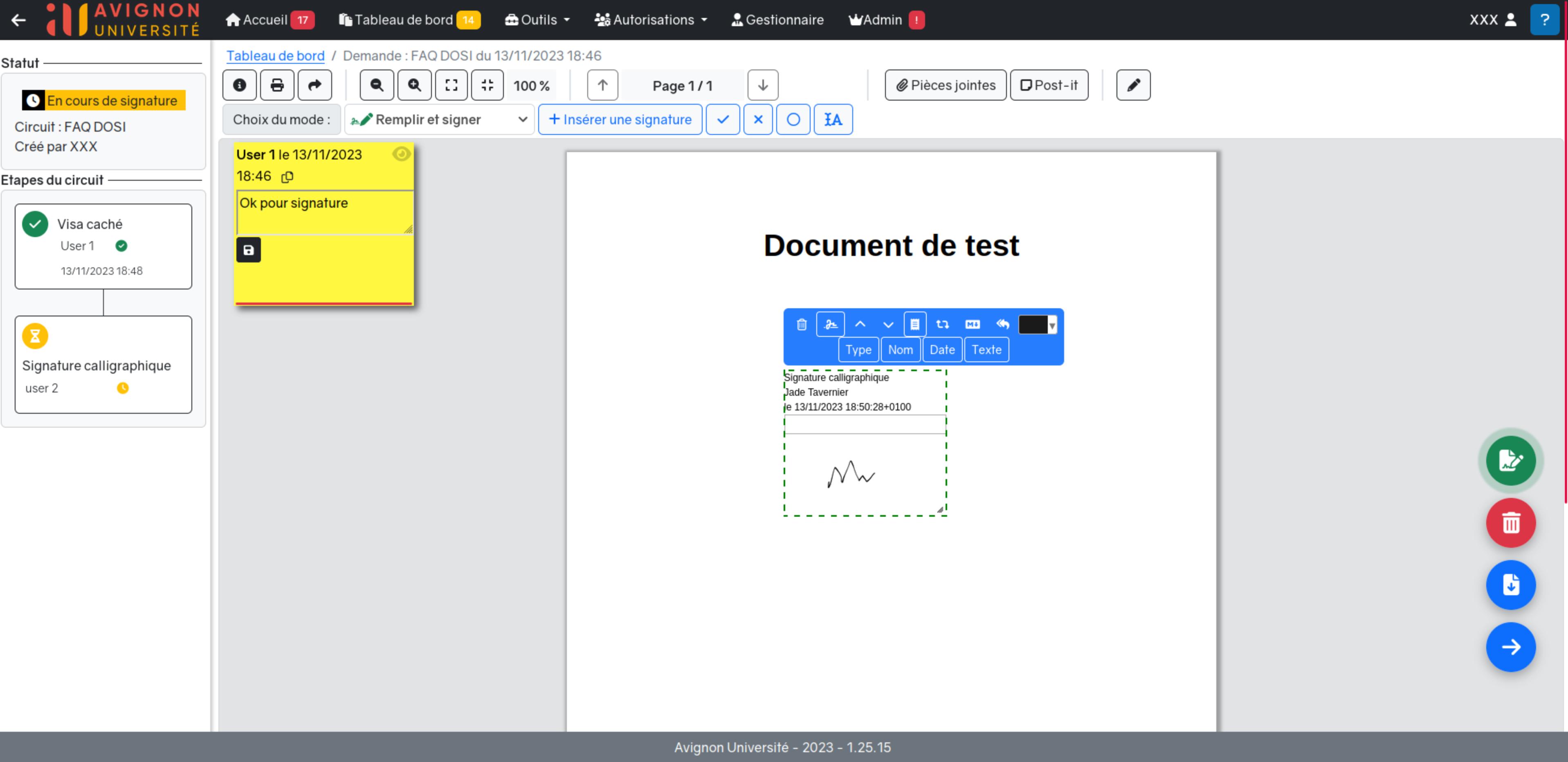 Sur la partie gauche on peut suivre l’avancement du circuit de signature. On voir aussi que l’outil propose un système de « Post-it » permettant à chaque étape de saisir un message à destination du participant suivant. De plus, il est possible à tout moment d’ajouter des pièces jointes au document à signer (celle-ci ne seront pas signées).