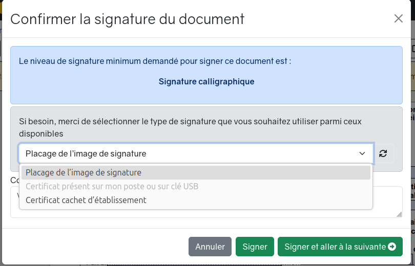 La signature électronique nécessite soit la présence d’un keystore dans le profil utilisateur, soit de disposer d’une clé cryptographique matérielle (dans l’interface on distinguera donc « signature électronique et signature avec clé matérielle »). Ce niveau de signature n’est accessible qu’à certaines personnes de l’établissement.