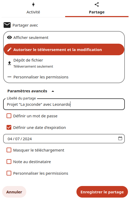 On peut choisir les paramètres du partage avec le menu Personnaliser le lien, en particulier une date d’expiration ou les permissions d’accès aux fichiers. Voir Partage avec une adresse mail pour le détail des paramètres.